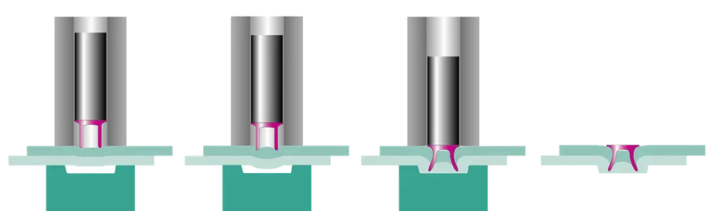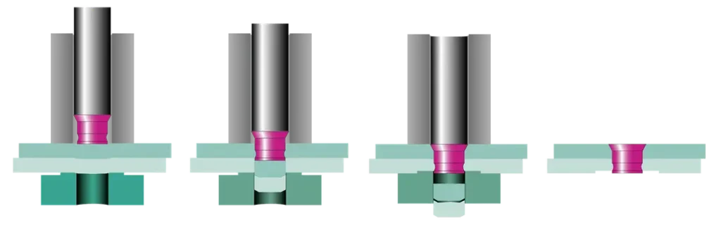 El nombre del remache de punzón sólido revela sus capacidades: primero, corta todos los materiales de unión y luego rellena la cavidad creada. Presiona la pieza perforada para separarla de la unión y se deforma, deformando también la unión. Esto crea una conexión estable de hasta tres capas de materiales diferentes.