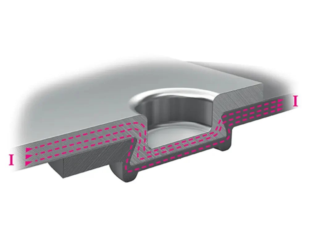 Durante el proceso de clinchado, además del bloqueo positivo y la conexión por fricción, también se produce una unión parcial del material en la zona de unión: Las láminas unidas fluyen entre sí de tal forma que se crea una unión óptimamente conductora con la menor resistencia de contacto posible gracias a un gran número de microcontactos.